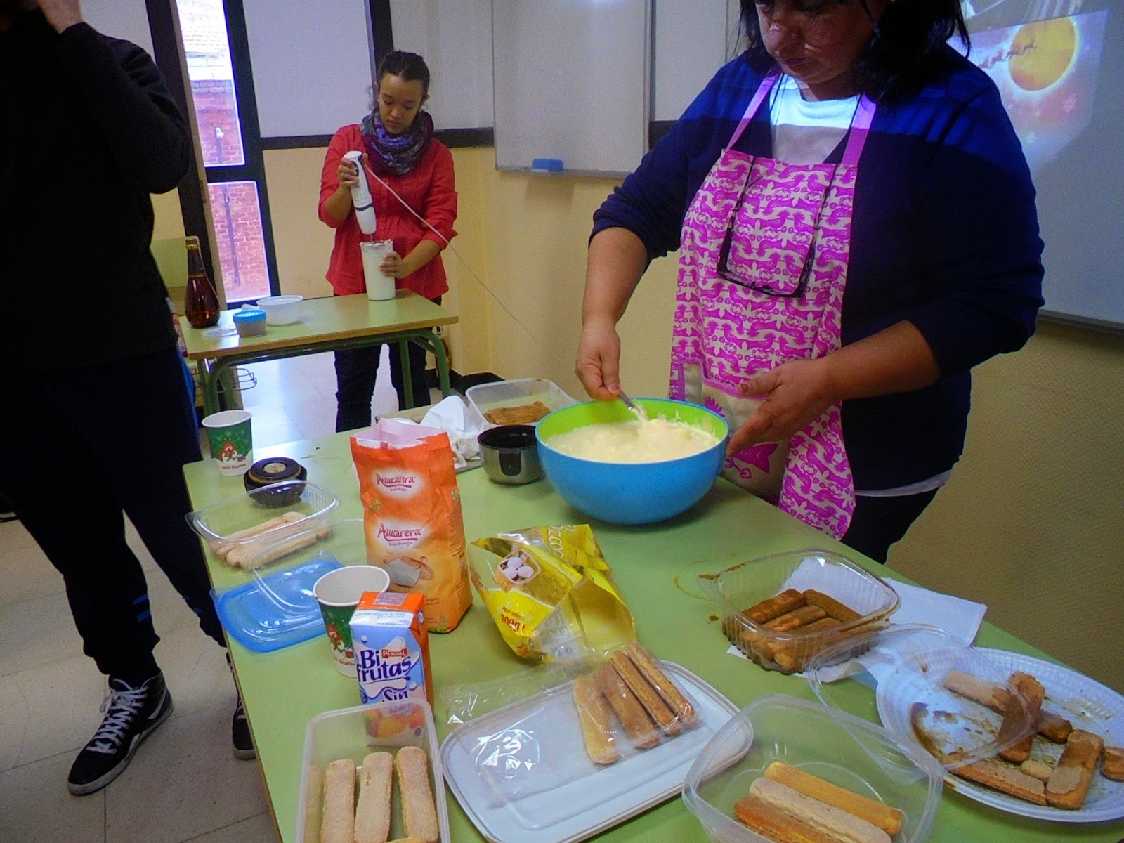 Per il tiramisù, qualcuno ha portato gli ingredienti cioè savoiardi, caffé, amaretto, uova, cacao amaro, zucchero e mascarpone. La parte più difficile è stata montare a neve gli albumi perché avevamo soltanto un recipiente. E tutto questo mentre un compagno diceva gli ordini all'imperativo.